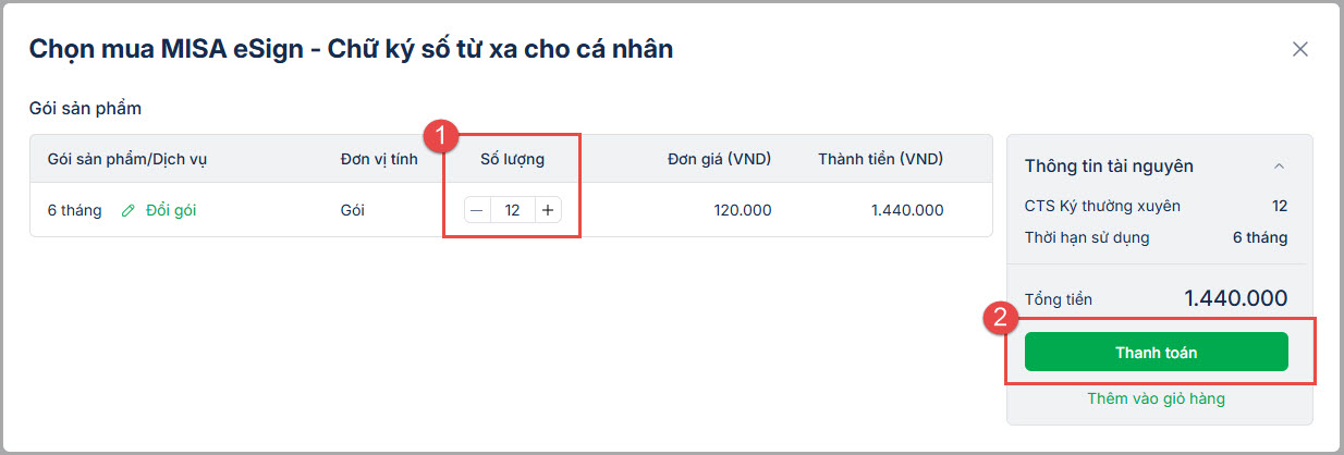 • Mục đích: Giúp Khách hàng mua được nhiều CTS eSign Cá nhân gói thường xuyên cho nhân viên trong Doanh nghiệp trong cùng 1 đơn hàng.