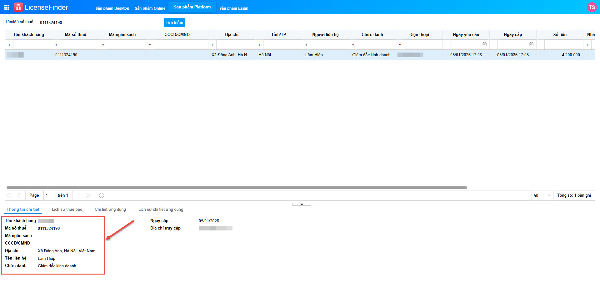 • Anh/chị truy cập License Finder/Sản phẩm Platform tại đây => nhập MST của Khách hàng => kiểm tra thông tin tại tab Thông tin chi tiết.