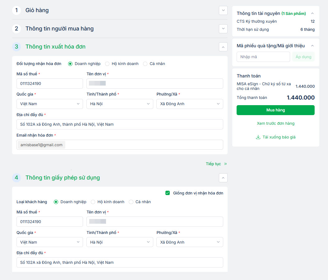 • Ở bước này, anh/chị kiểm tra lại Giỏ hàngThông tin tài nguyên và nhập đầy đủ các thông tin sau: