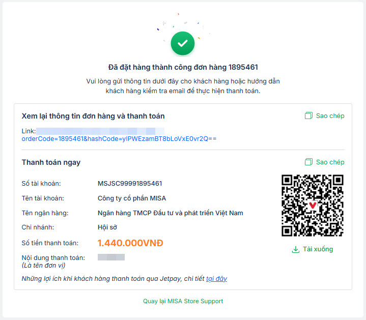 • Đặt hàng thành công, anh/chị gửi thông tin cho Khách hàng và Khách hàng sẽ thực hiện thanh toán.