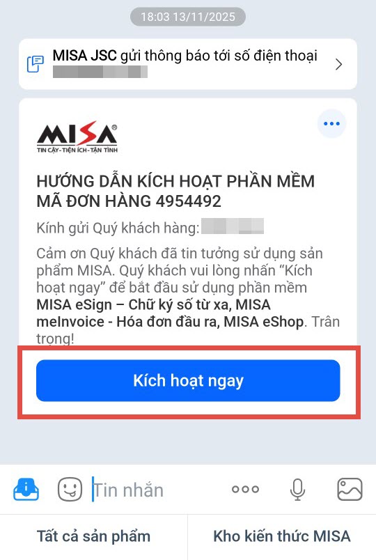 - Mua hàng và thanh toán thành công, hệ thống sẽ gửi tin nhắn kích hoạt đến tài khoản Zalo trên điện thoại của Khách hàng.