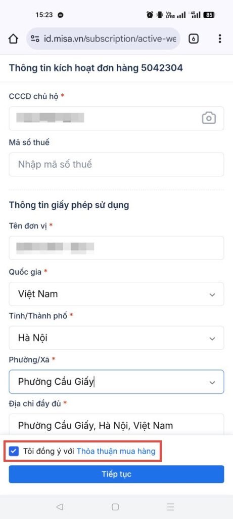 - Sau đó tích chọn Tôi đồng ý với Thỏa thuận mua hàng => nhấn Tiếp tục.
