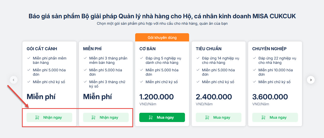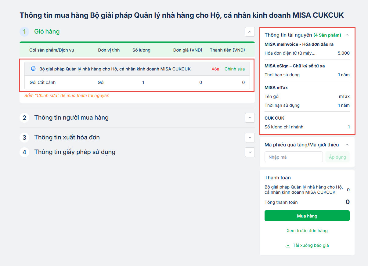 - MISA đã bổ sung gói Oneapp mới theo chính sách hợp tác và chỉ Techcombank mới có thể thực hiện mua bán đối với các gói sản phẩm này.