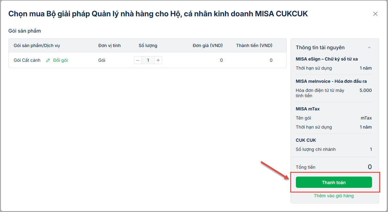 - Với đơn mua mới, hệ thống sẽ mặc định số lượng gói là 1.