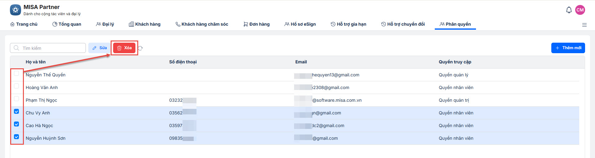 2.4. Phân quyền truy cập (Chức năng này chỉ hiển thị với tài khoản quyền chủ đối tác)
