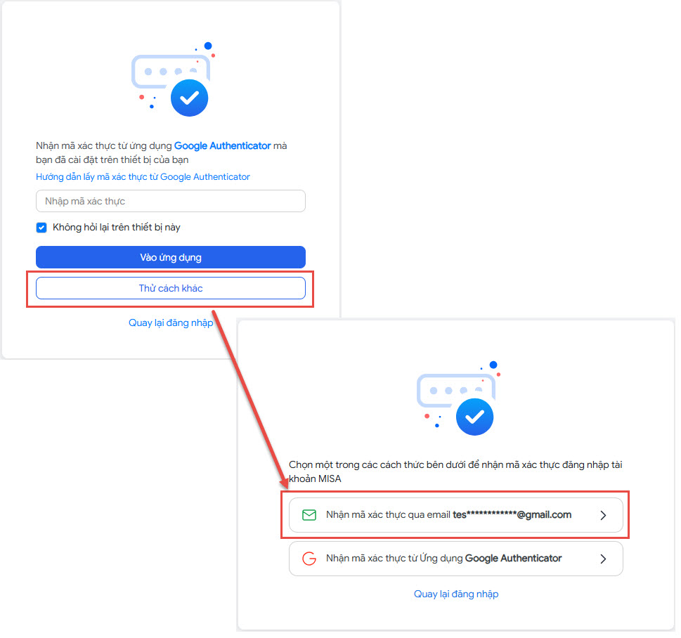 - Hệ thống sẽ yêu cầu nhập mã xác thực, anh/chị nhấn Thử cách khác => Nhận mã xác thực qua email.