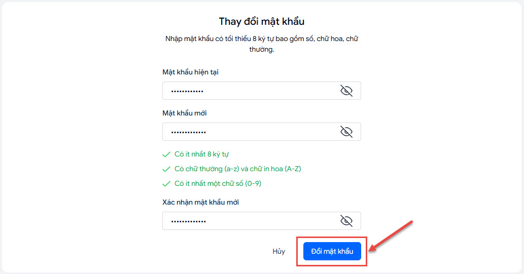 - Anh/chị nhập mật khẩu hiện tại => thiết lập mật khẩu mới => nhấn Đổi mật khẩu.