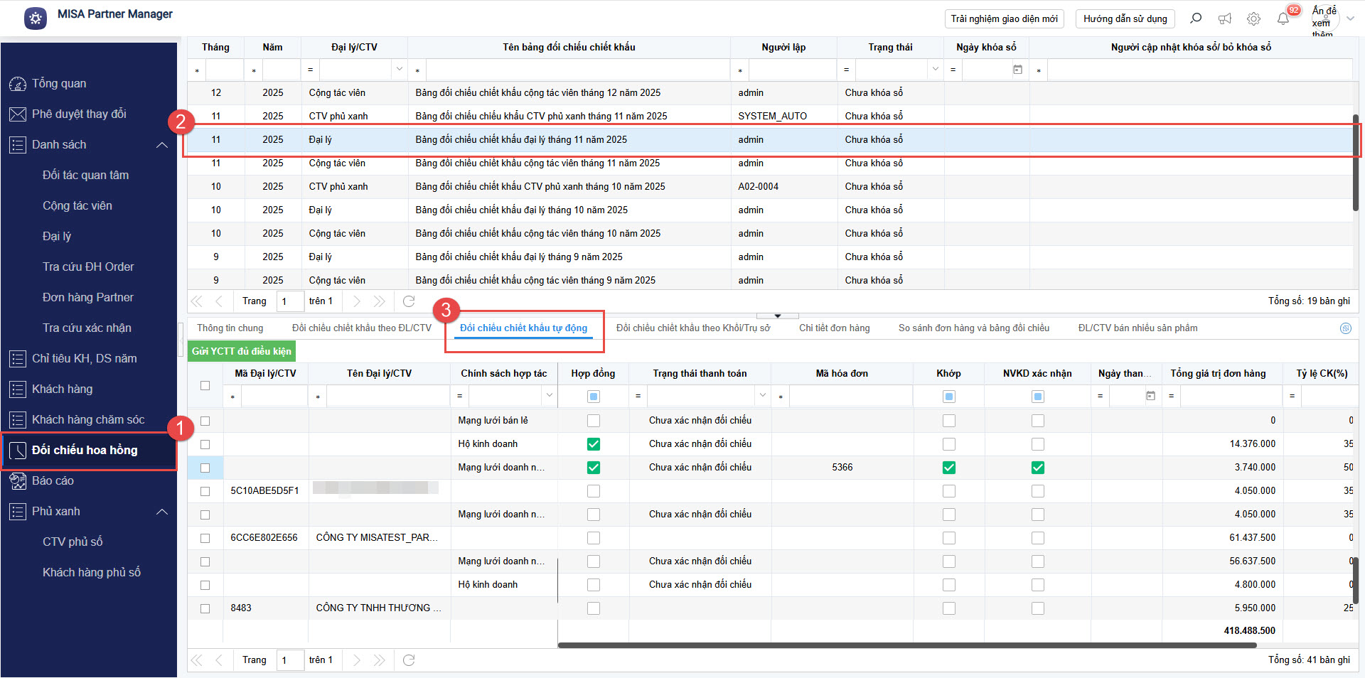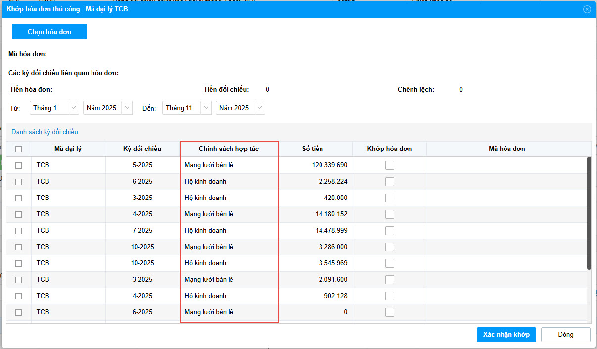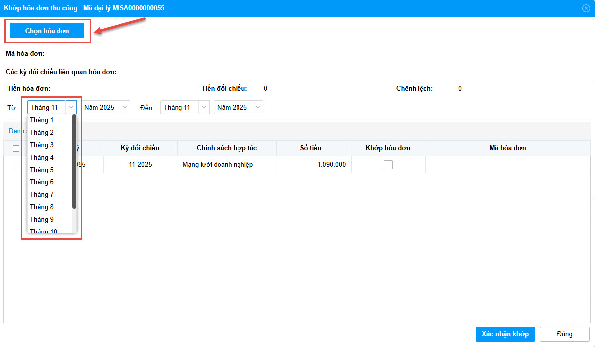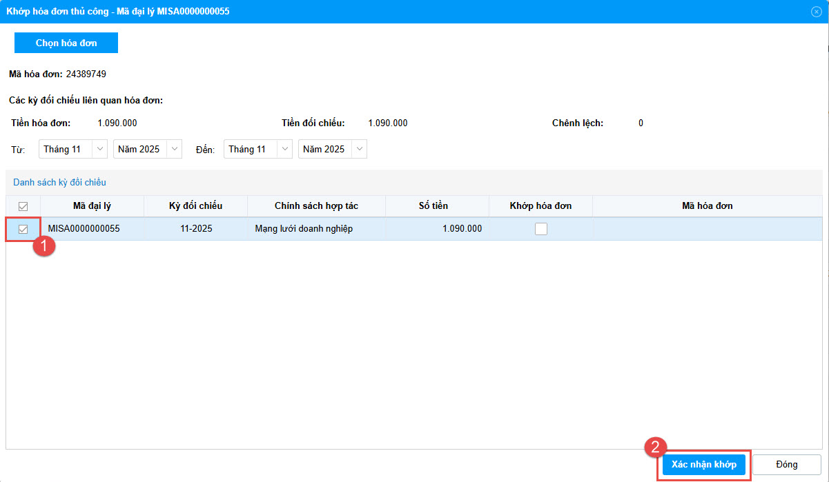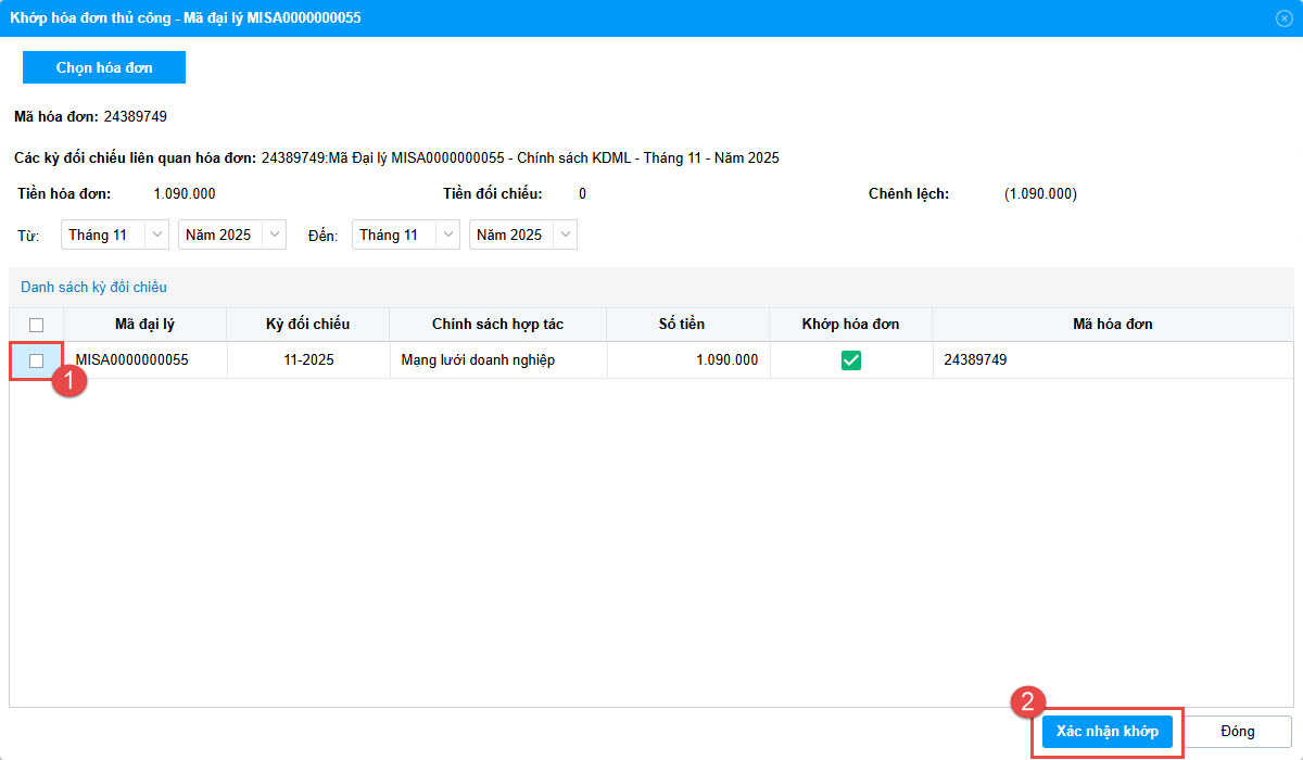 - Với những trường hợp hóa đơn và chiết khấu chưa khớp tự động, anh/chị thực hiện khớp hóa đơn thủ công.