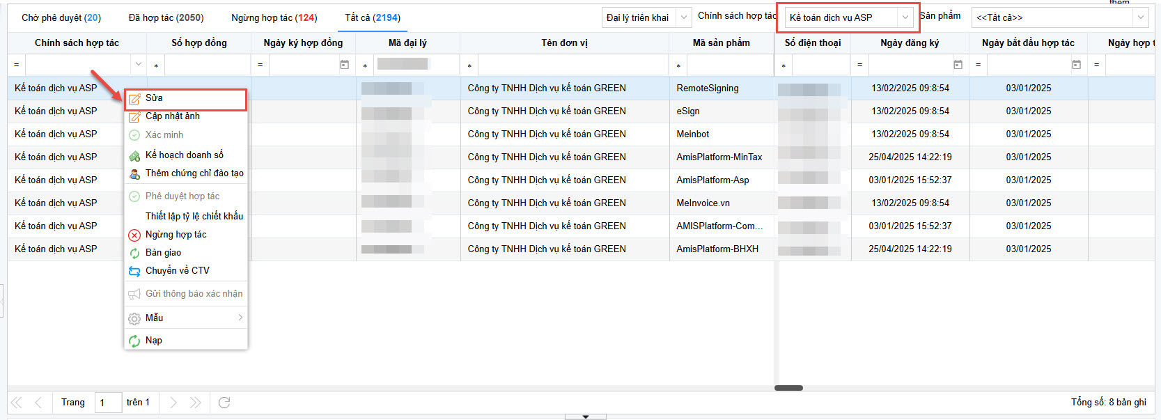 - Sau đó click chuột phải tại dòng đại lý => nhấn Sửa.