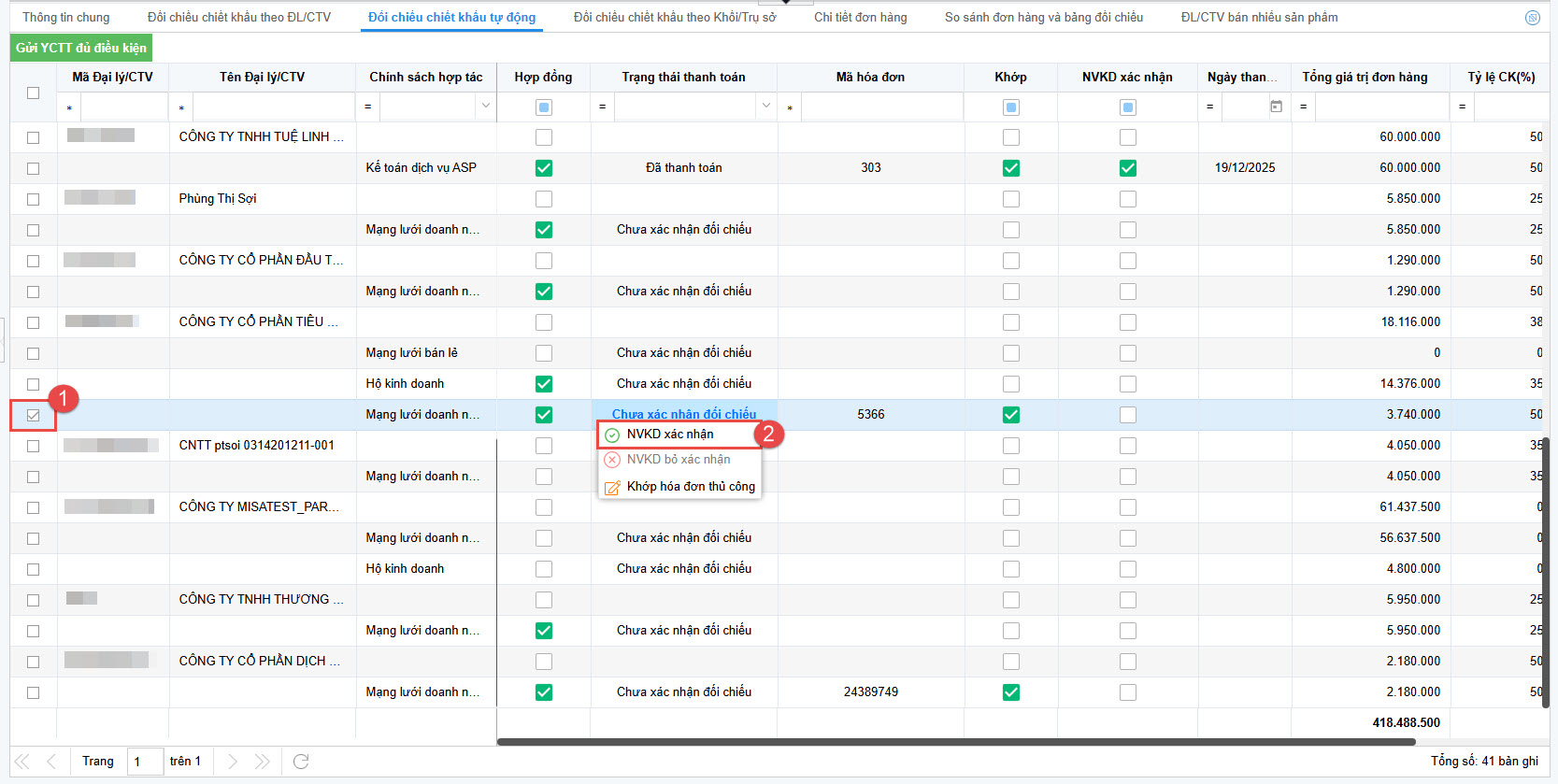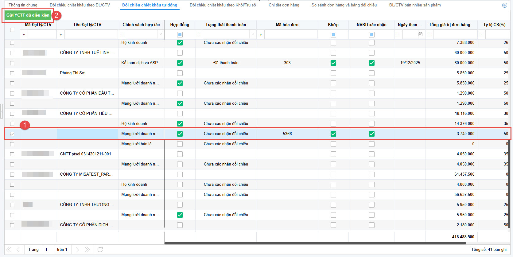 2.1. Kiểm tra đối chiếu chiết khấu và gửi YCTT đủ điều kiện của Đại lý
