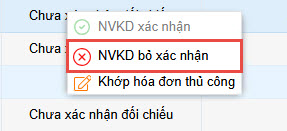 - Trong trường hợp muốn bỏ xác nhận khớp cho hóa đơn, anh/chị thực hiện click chuột phải => nhấn Khớp hóa đơn thủ công => Chọn hóa đơn tương tự như thao tác khớp hóa đơn.