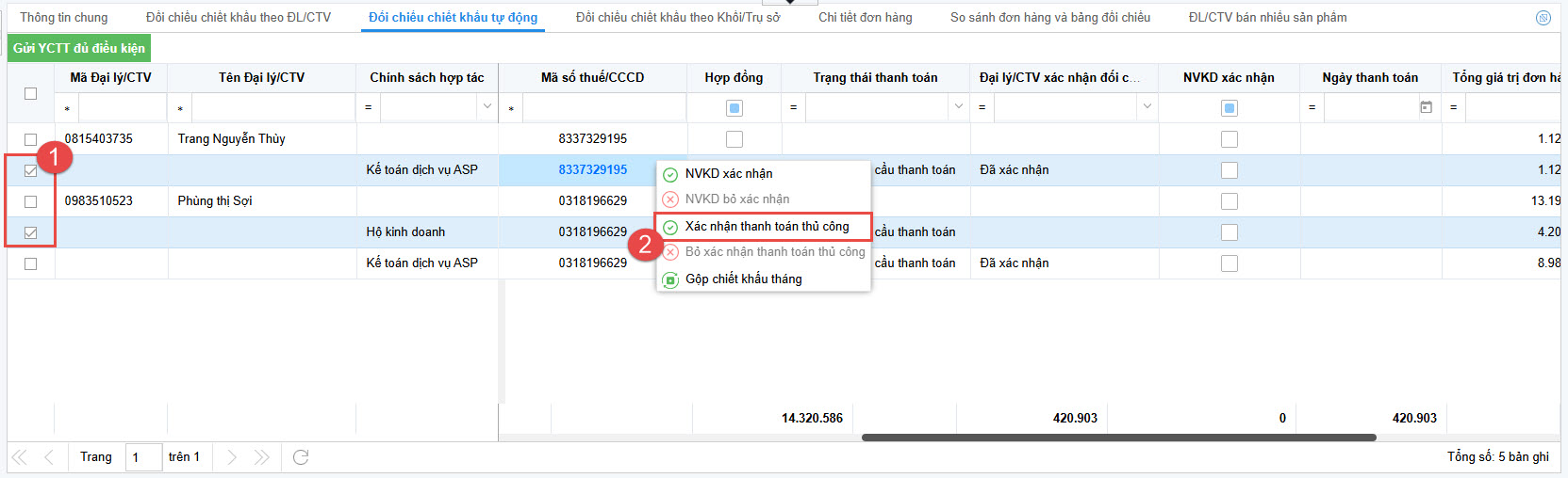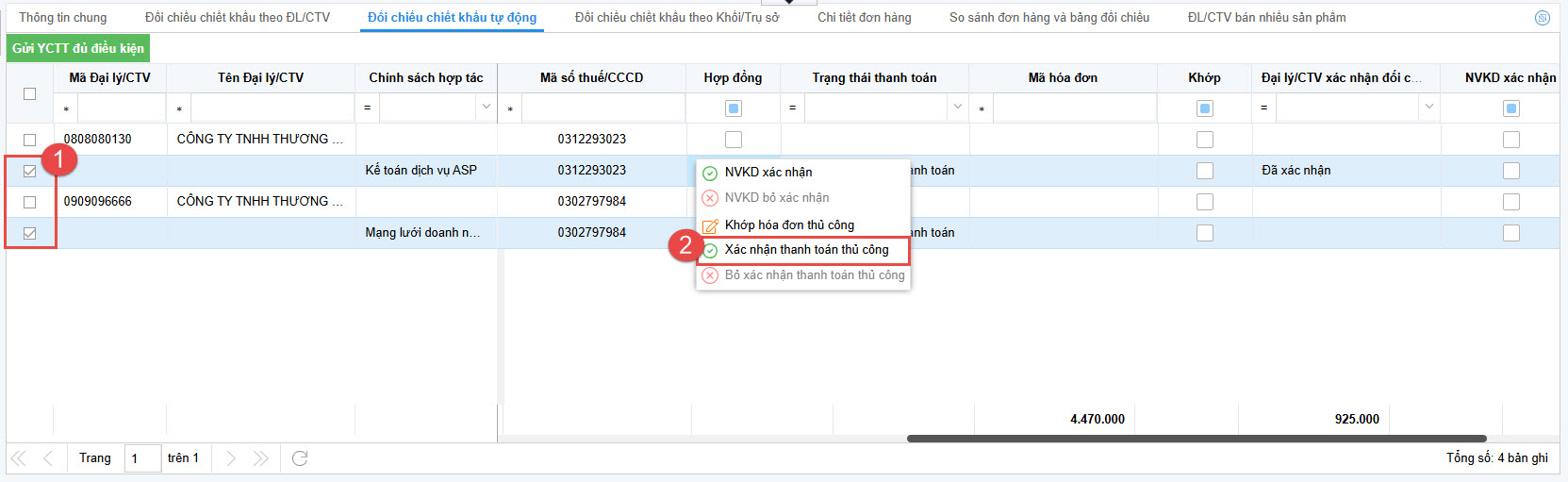- Sau đó truy cập Partner Manager, tích chọn các chính sách đó => click chuột phải => nhấn Xác nhận thanh toán thủ công.