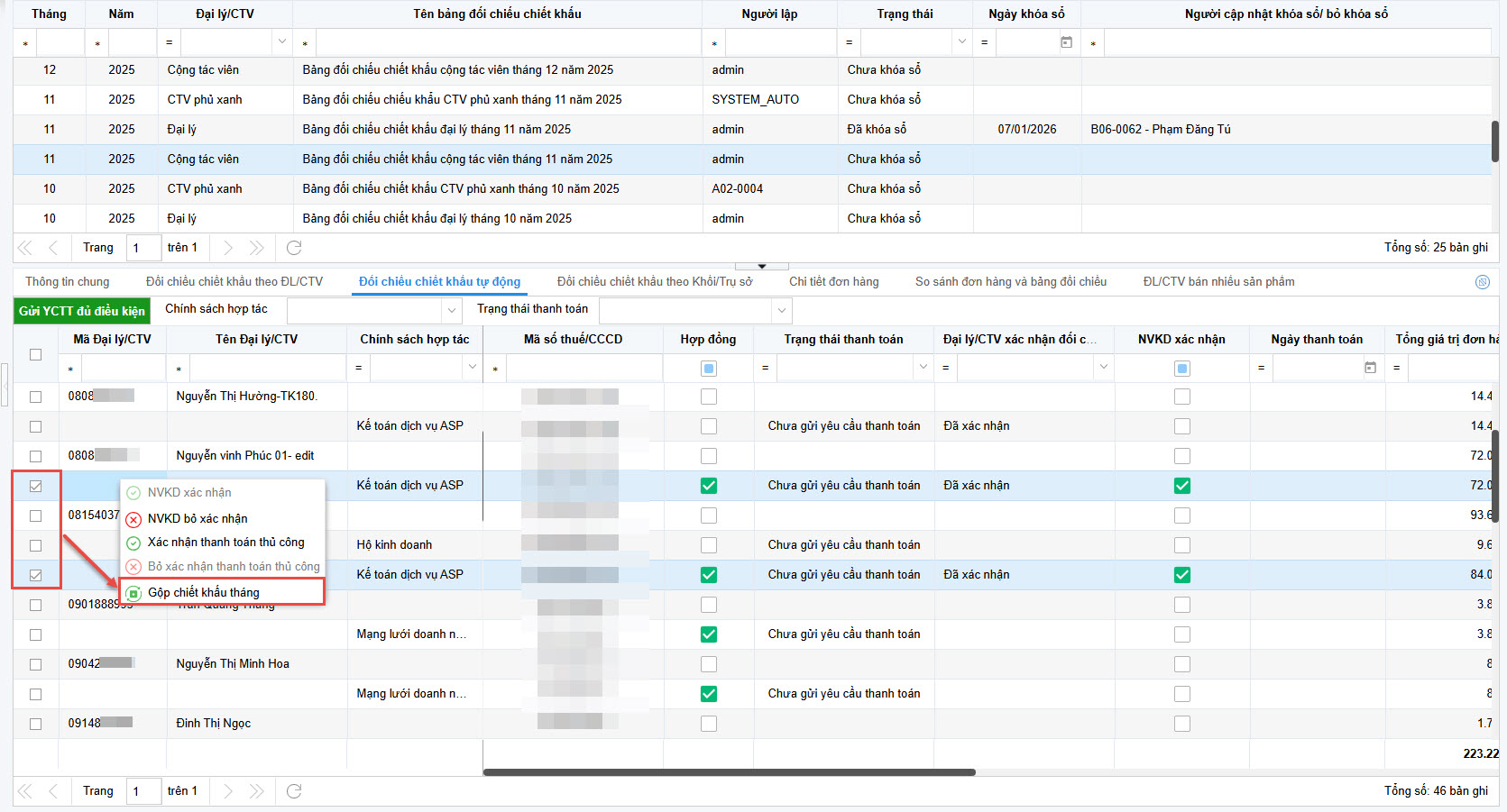 - Với những CTV muốn gộp chiết khấu nhiều tháng, anh/chị tích chọn CTV => click chuột phải => chọn Gộp chiết khấu tháng.