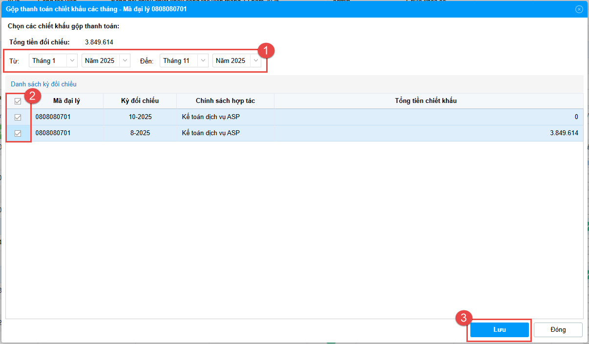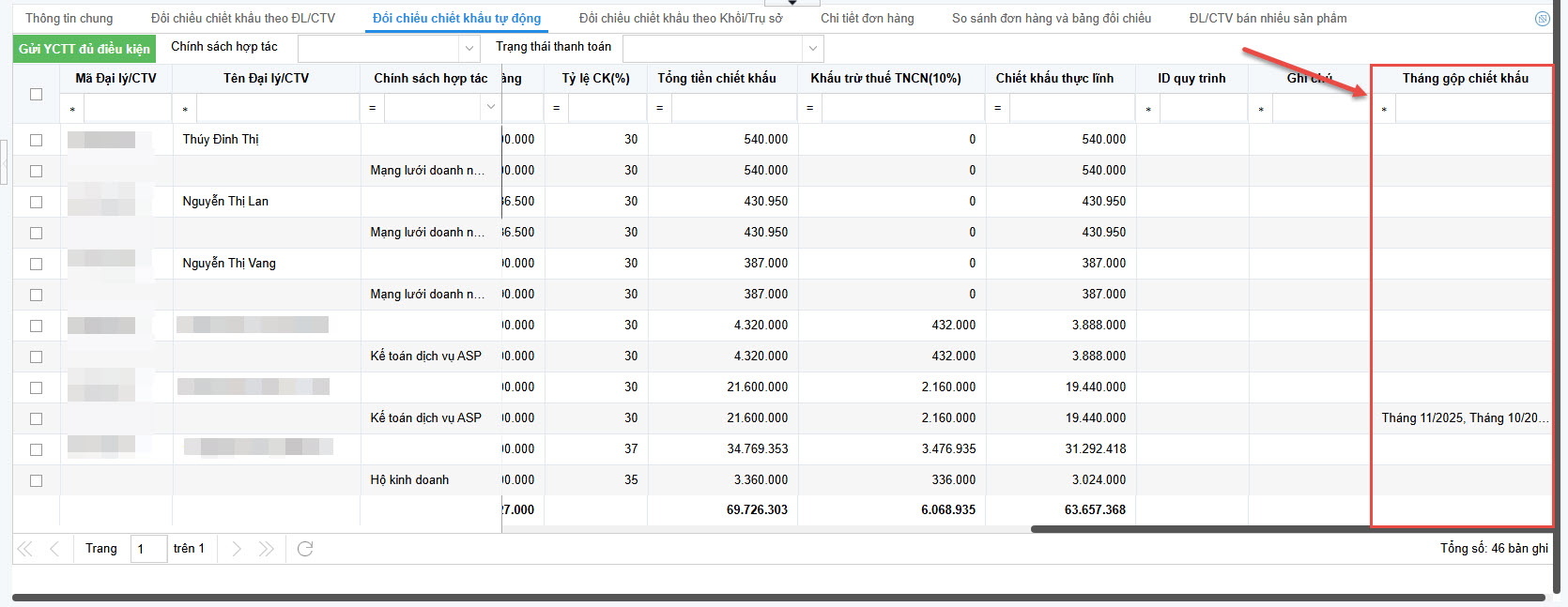 - Sau khi gộp thành công, anh/chị kiểm tra thông tin các tháng gộp tại cột Tháng gộp chiết khấu.
