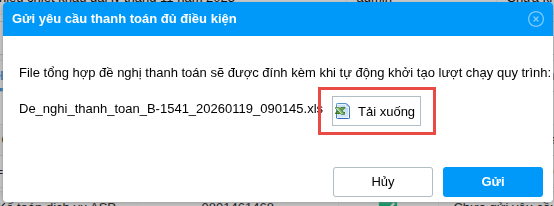 - Trước khi gửi yêu cầu, anh/chị có thể tải xuống file tổng hợp đề nghị thanh toán để xem trước. Sau đó nhấn Gửi.