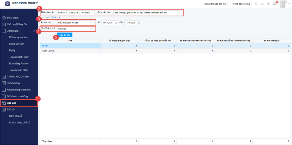 - Hướng dẫn Quản lý xem trang Báo cáo hiệu quả kênh Cộng tác viên (CTV) phủ số theo Tỉnh/Thành phố của Khách hàng (KH) trên MISA Partner Manager.