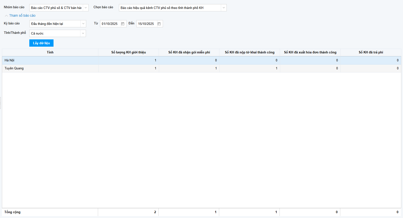 - Chọn báo cáo: Báo cáo hiệu quả CTV phủ số theo tỉnh thành phố KH.