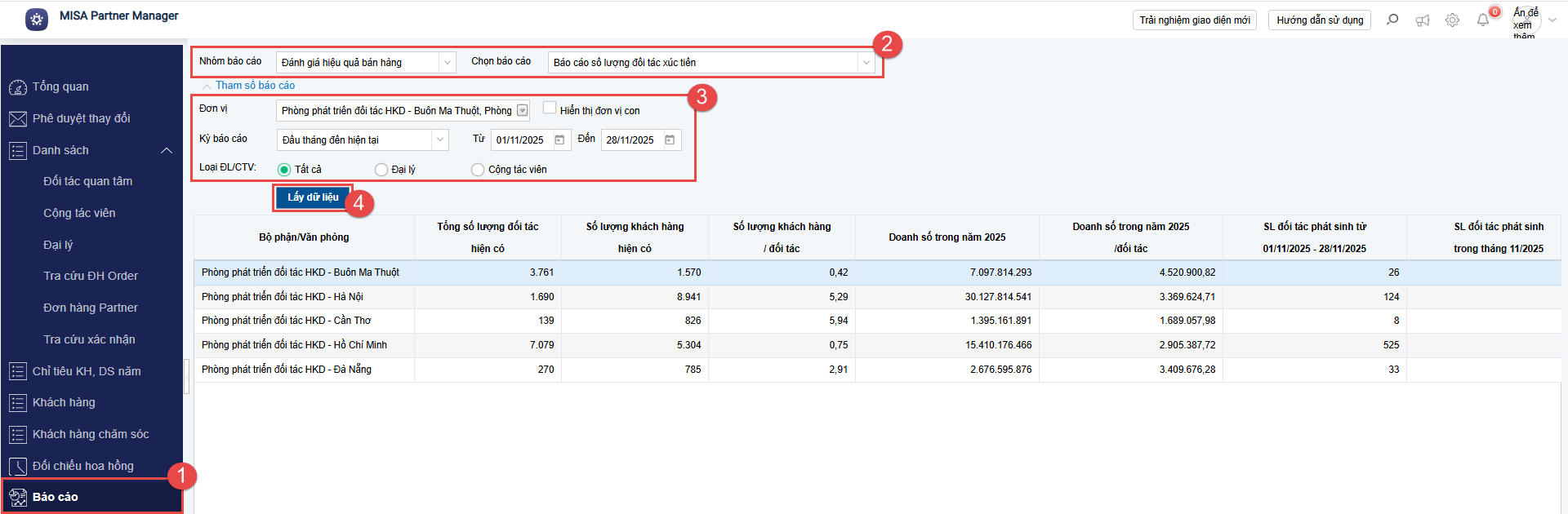 4. Hướng dẫn Quản lý xem Báo cáo số lượng đối tác xúc tiến
