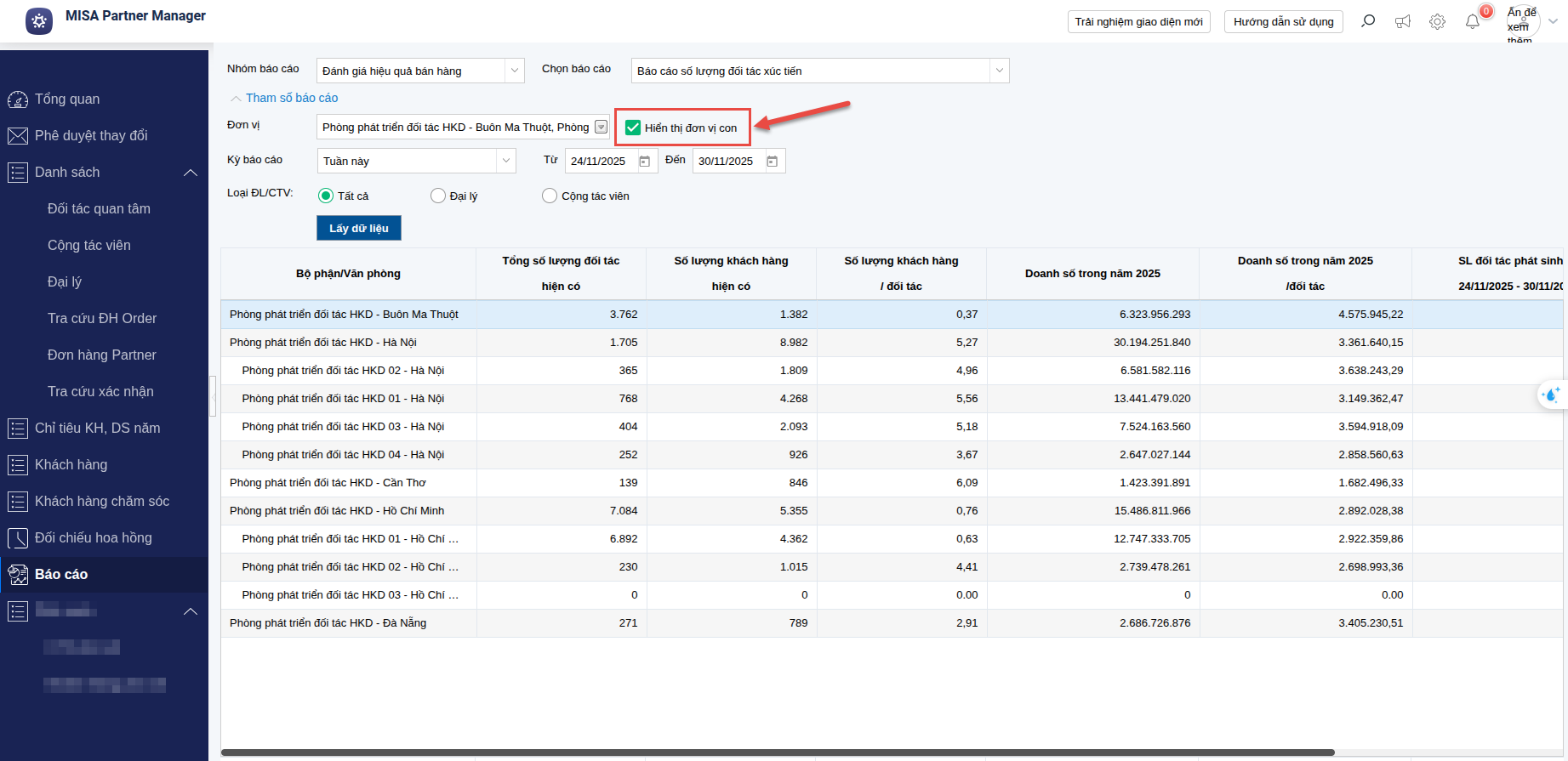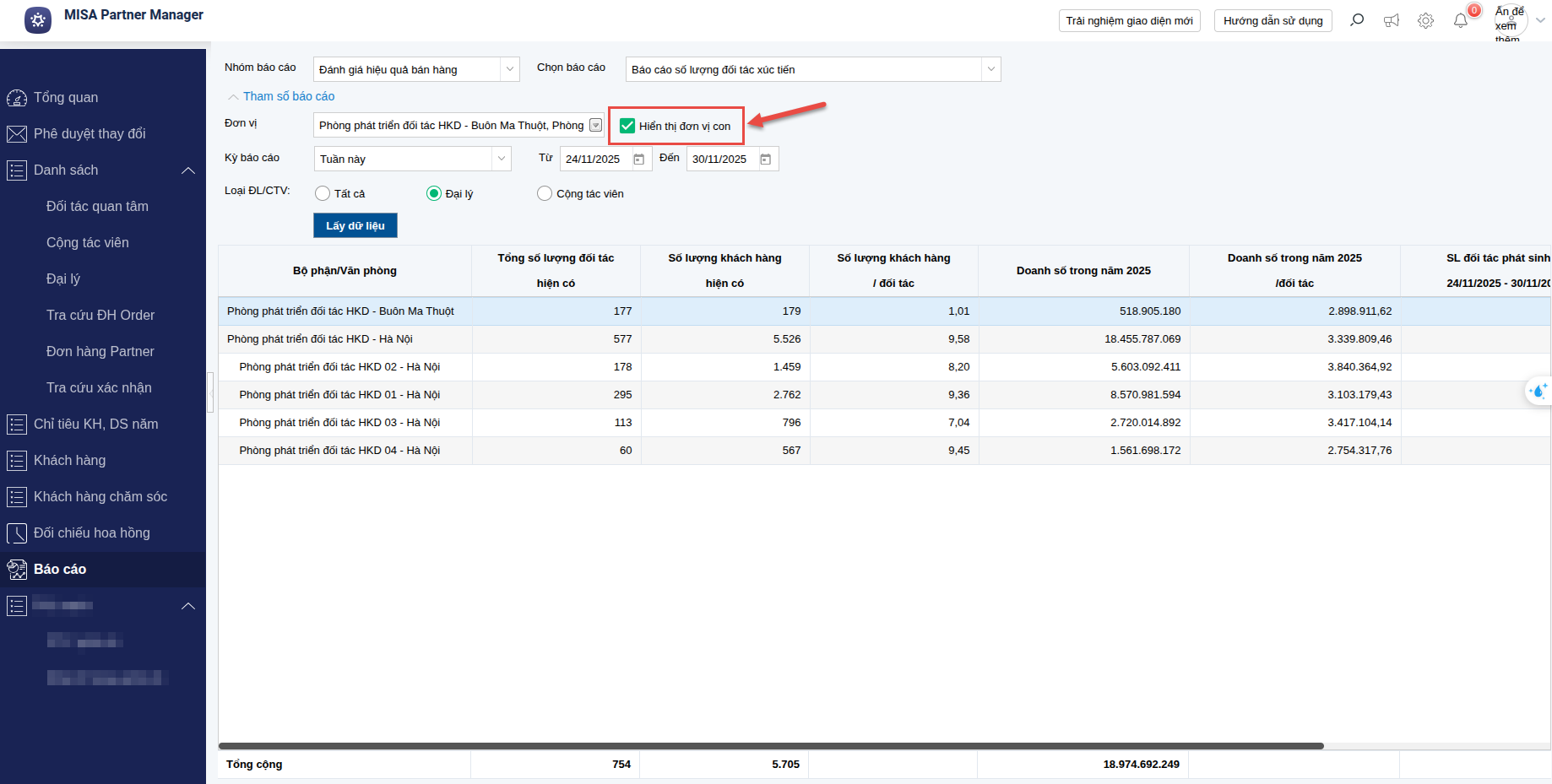 Hướng dẫn Quản lý xem Báo cáo số lượng đối tác xúc tiến