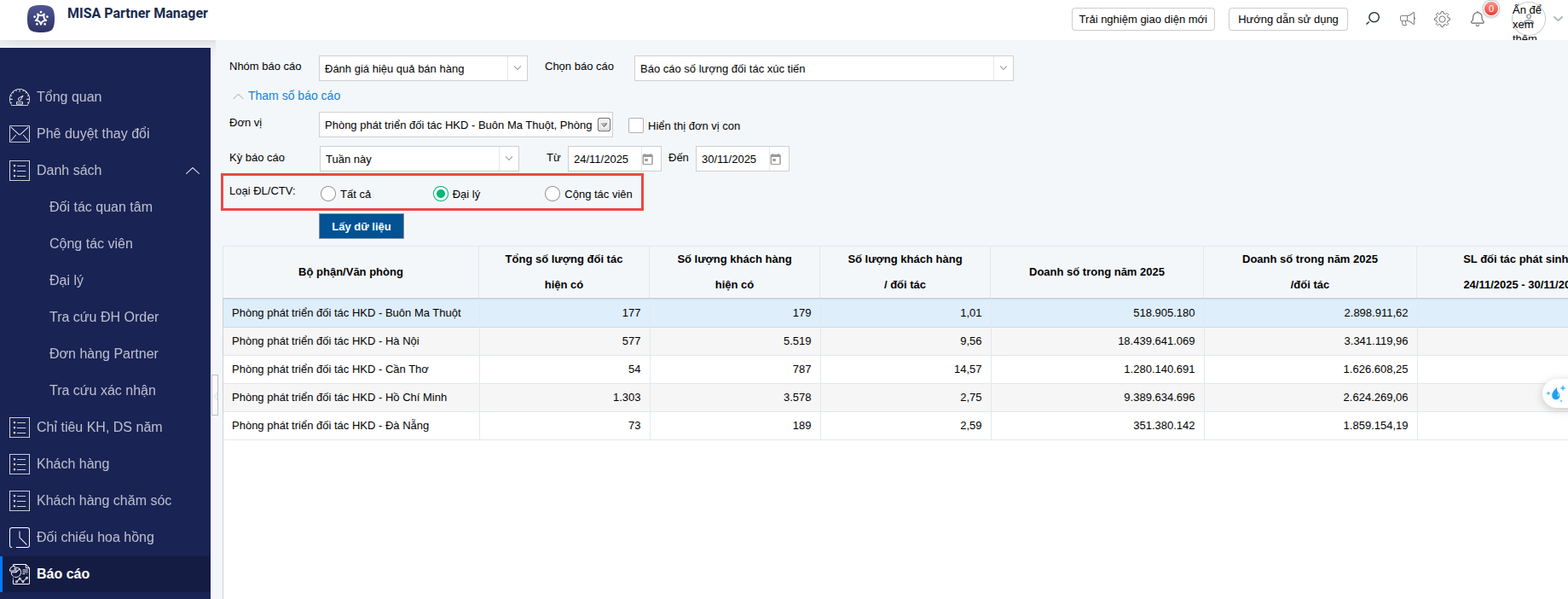 • (1) Tổng số lượng đối tác hiện có: Tổng số đối tác đang hoạt động lũy kế đến thời điểm hiện tại.