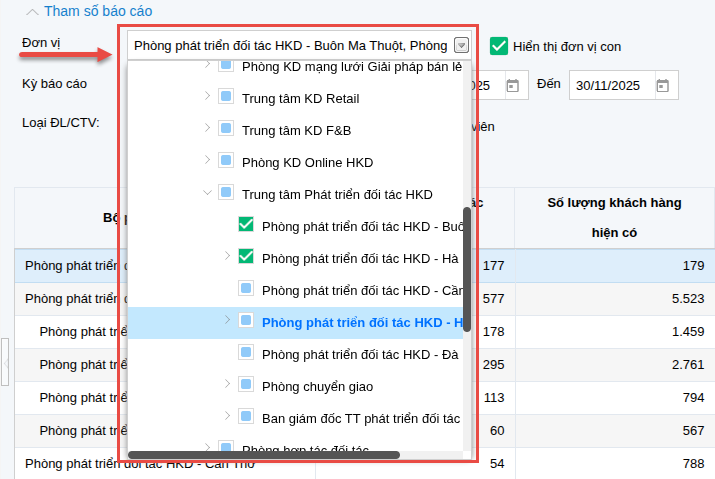 Với trường hợp anh/chị cần xem chi tiết theo đơn vị con, vui lòng tích chọn “Hiển thị đơn vị con”.