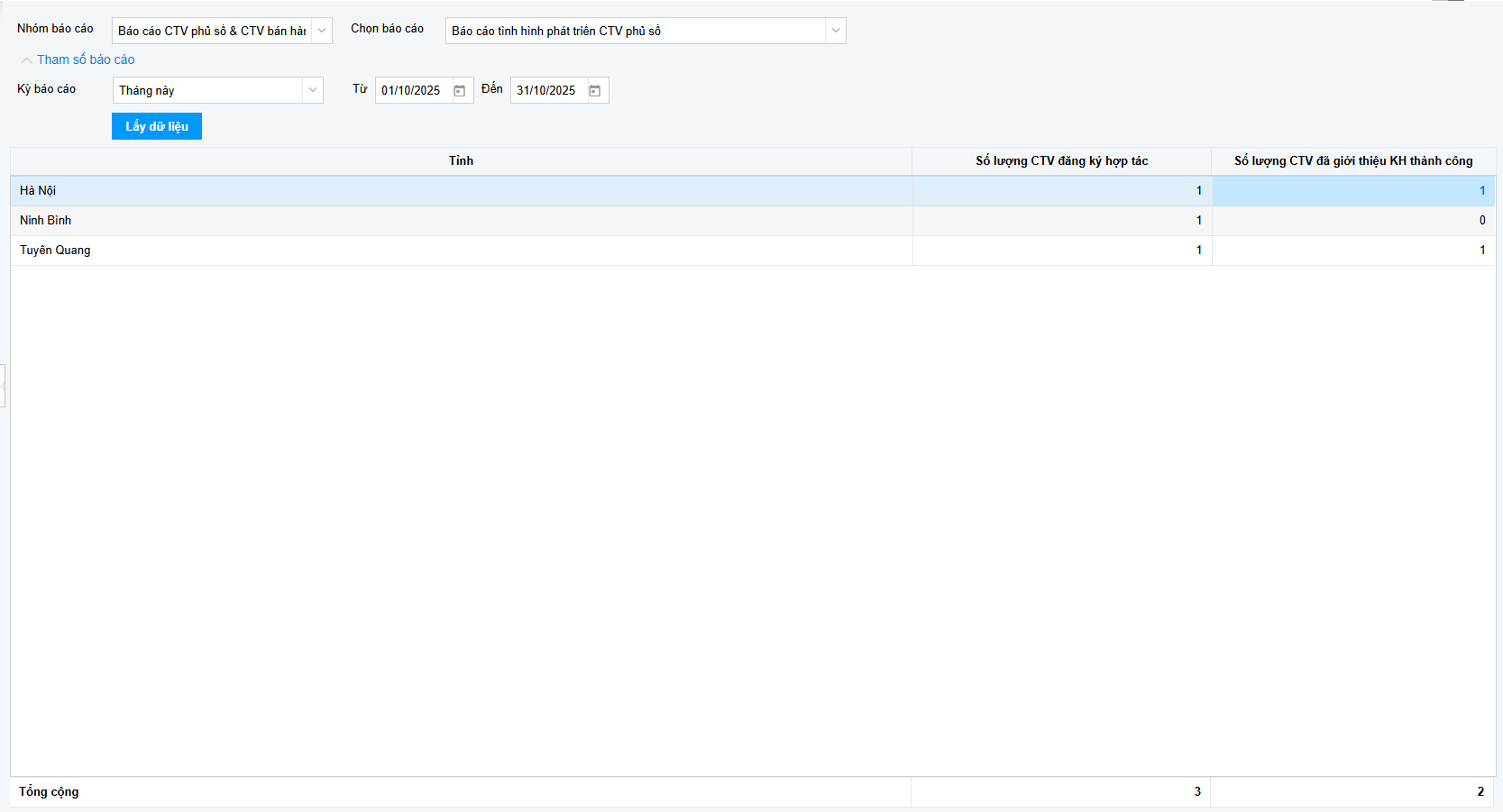 - Số lượng CTV đăng ký hợp tác: Tổng số cá nhân đã hoàn tất thủ tục đăng ký và trở thành CTV chính thức trong khoảng thời gian và địa bàn đã chọn.