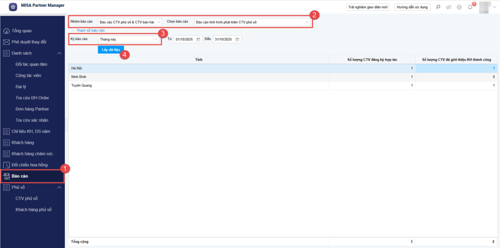 - Hướng dẫn Quản lý xem trang Báo cáo tình hình phát triển Cộng tác viên (CTV) phủ số trên MISA Partner Manager.