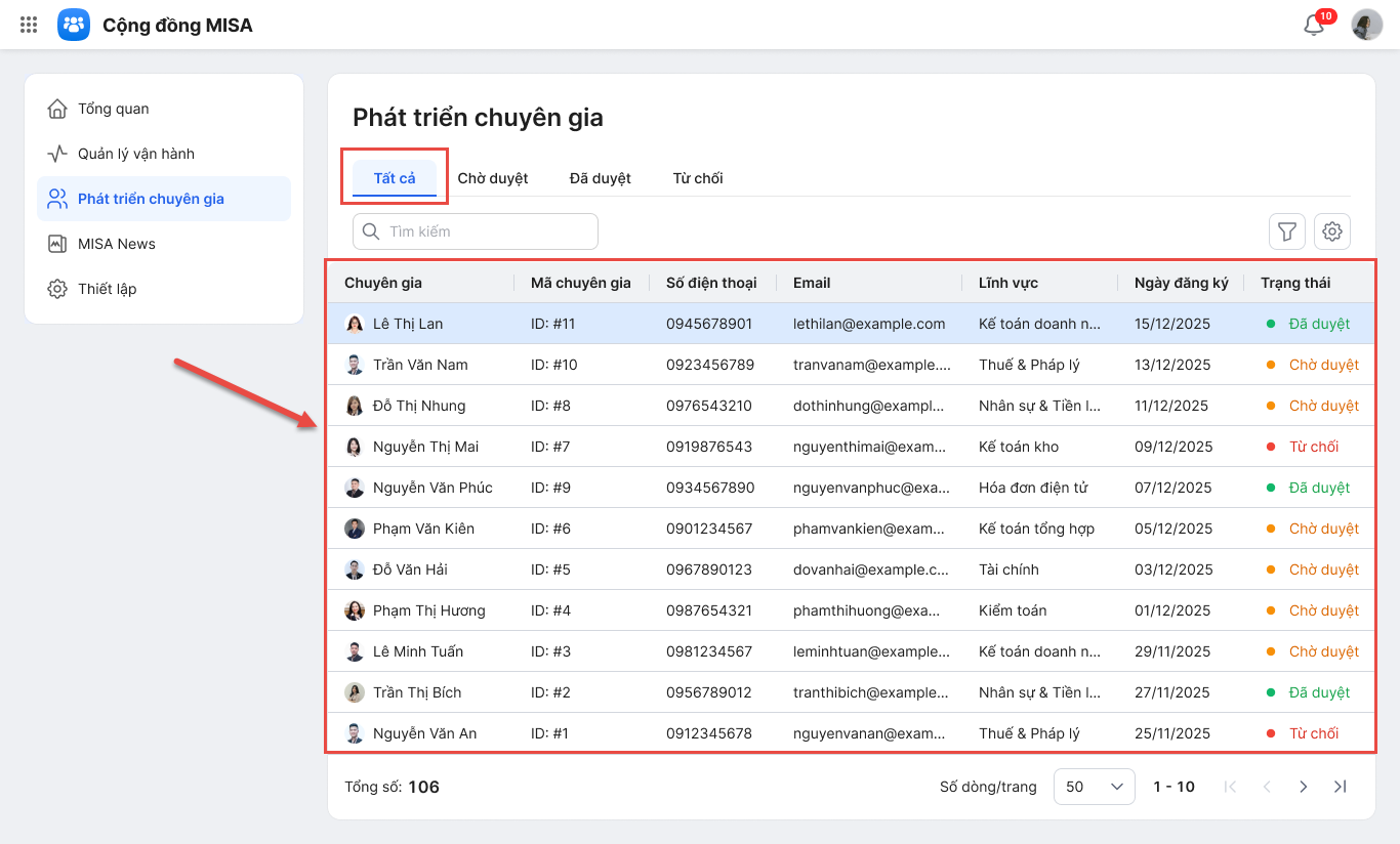 • Tại mục Tất cả hiển thị danh sách các Chuyên gia trong Cộng đồng, với tất cả các trạng thái Đã duyệt/Chờ duyệt/Từ chối.