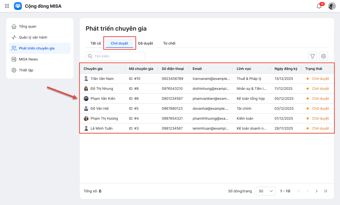• Với mục Chờ duyệt là danh sách các Chuyên gia đã gửi hồ sơ đăng ký mà Quản trị chưa duyệt.