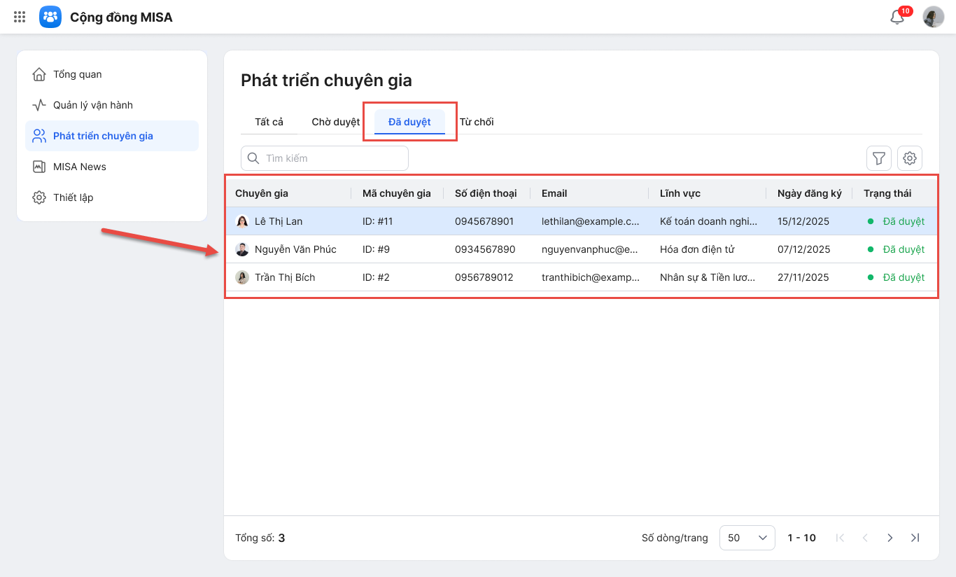 • Với mục Đã duyệt, hệ thống hiển thị các Chuyên gia đã được Quản trị duyệt hồ sơ đăng ký.