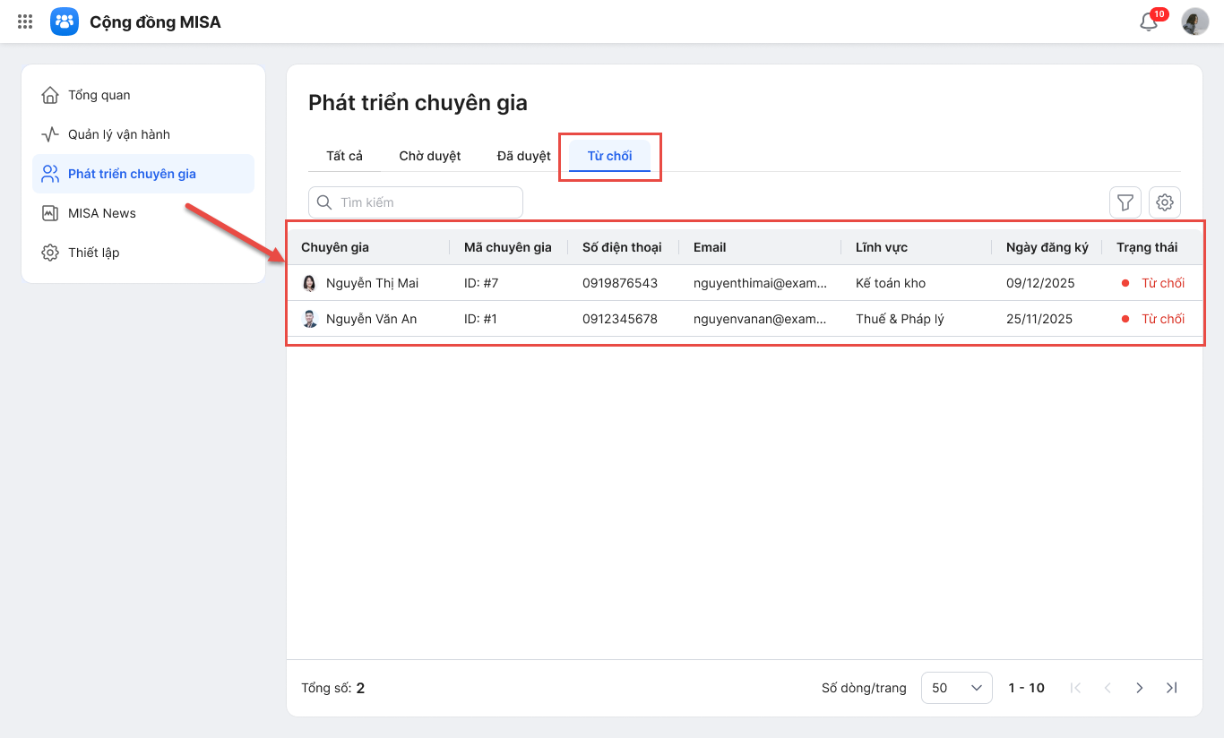 • Mục Từ chối hiển thị danh sách các Chuyên gia đã gửi hồ sơ đăng ký nhưng bị Quản trị từ chối.