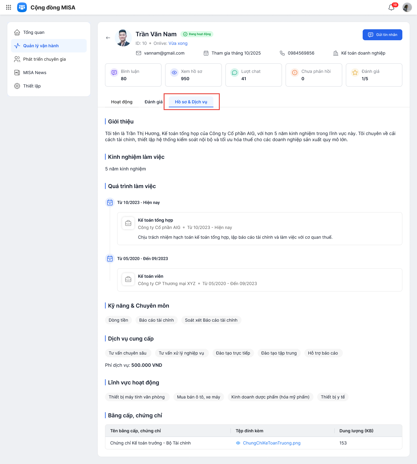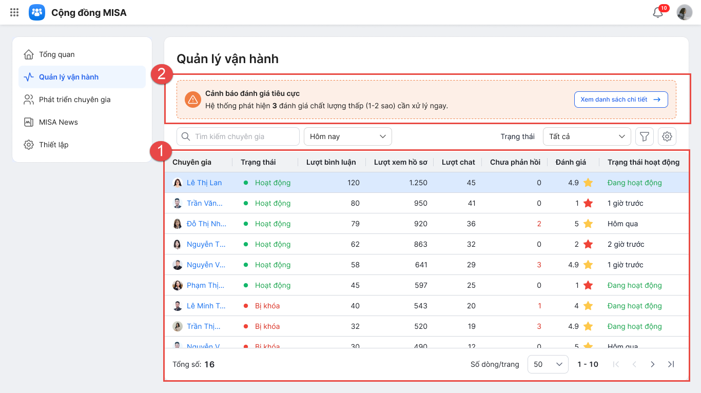 • Quản lý vận hành trang Cộng đồng: trạng thái hoạt động, lượt bình luận, lượt xem hồ sơ, lượt chat,… của các Chuyên gia.