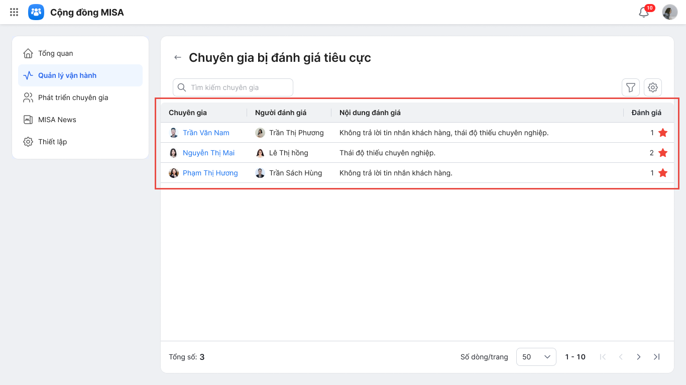 • Quản trị có thể nhấn Xem danh sách chi tiết để xem chi tiết các Chuyên gia bị đánh giá tiêu cực, Người dùng và nội dung chi tiết các đánh giá đó.