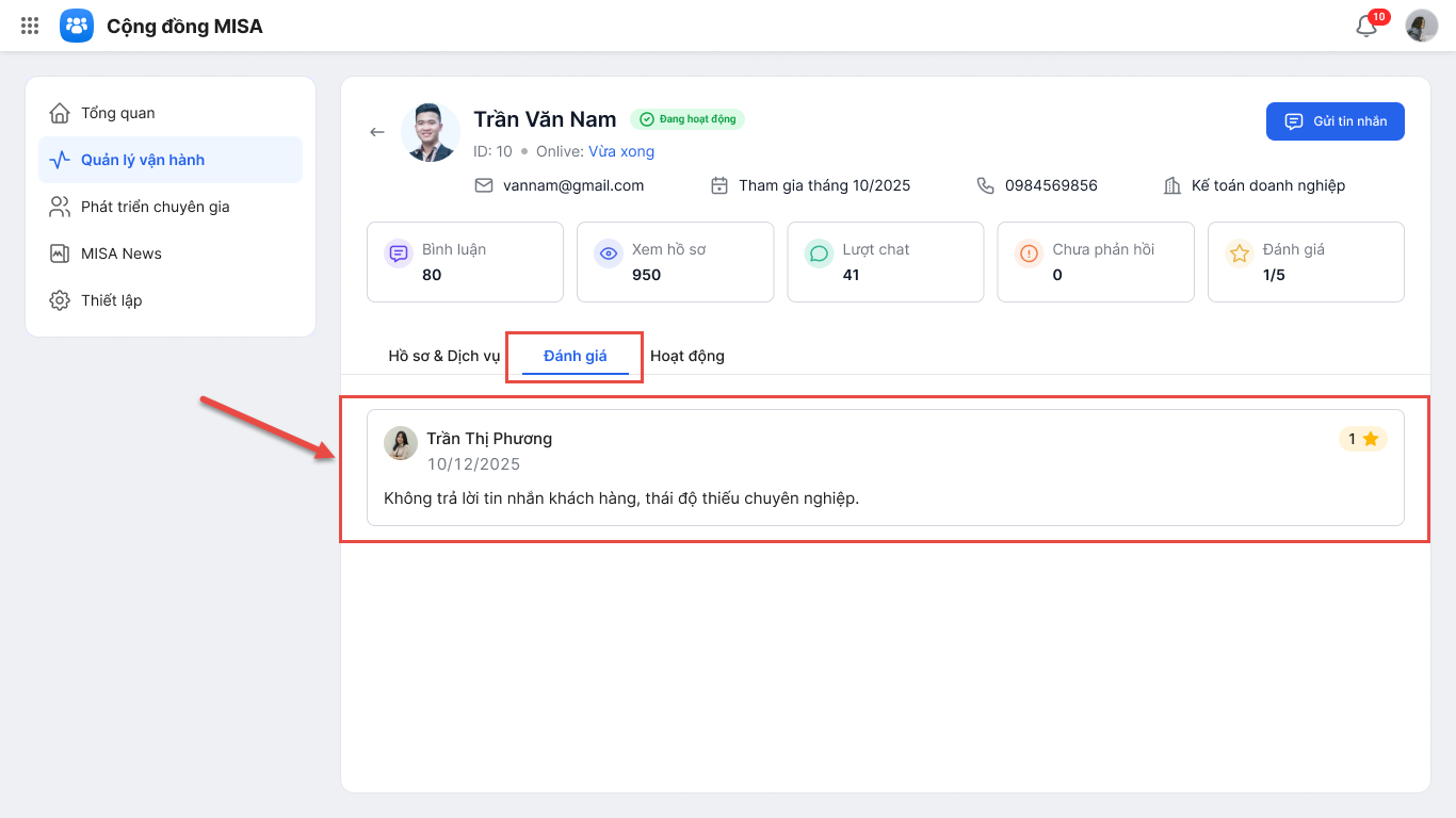 • Mục Đánh giá hiển thị các đánh giá của Khách hàng về Chuyên gia. Tại đây sẽ hiển thị đích danh Khách hàng, không hiển thị ẩn danh.