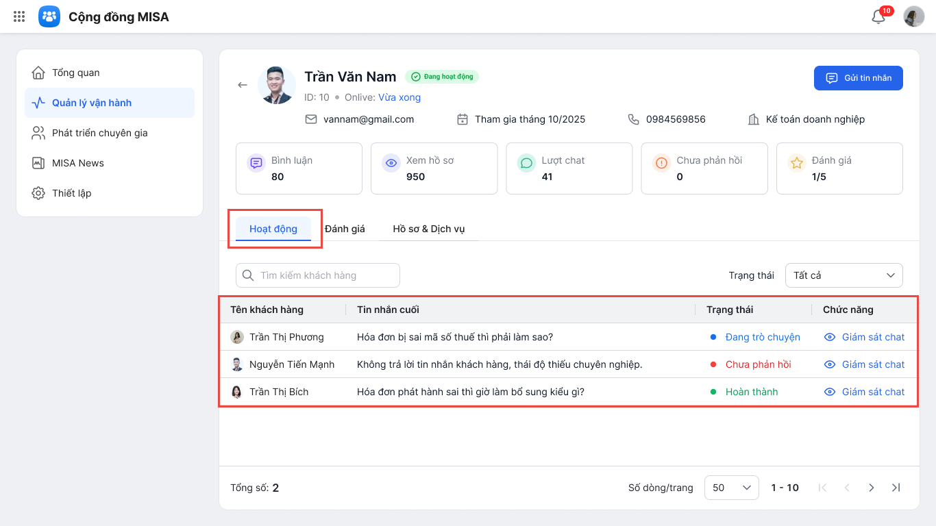• Mục Hoạt động: hiển thị tên khách hàng, tin nhắn cuối trong đoạn chat giữa Chuyên gia và Khách hàng, trạng thái đoạn chat và Quản trị có thể truy cập vào đoạn chat bằng cách nhấn Giám sát chat.