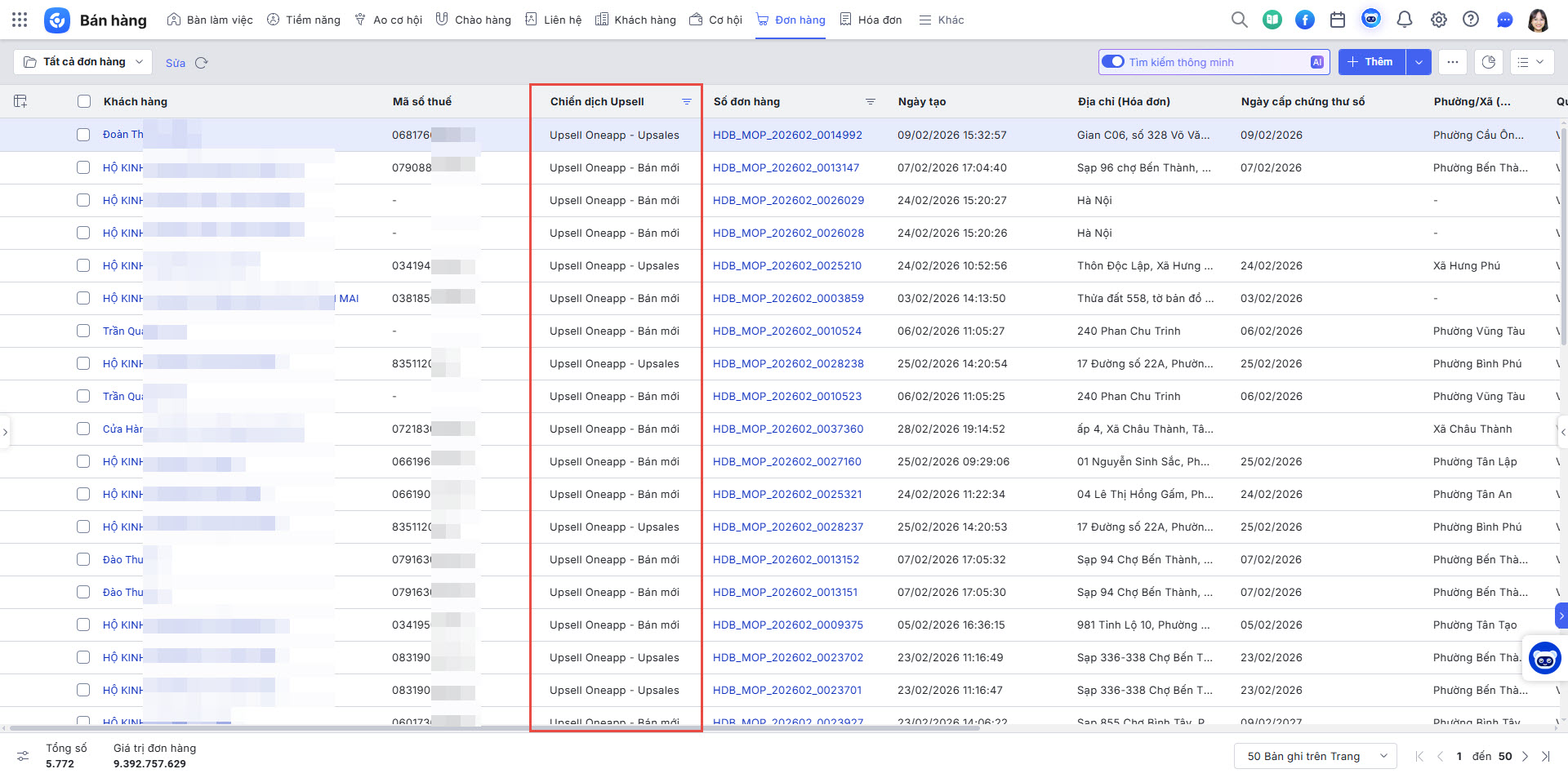 • Hệ thống sẽ dựa vào Đơn vị thực hiện trên đơn hàng để xác định Chiến dịch Upsell OneApp của TTKD tương ứng