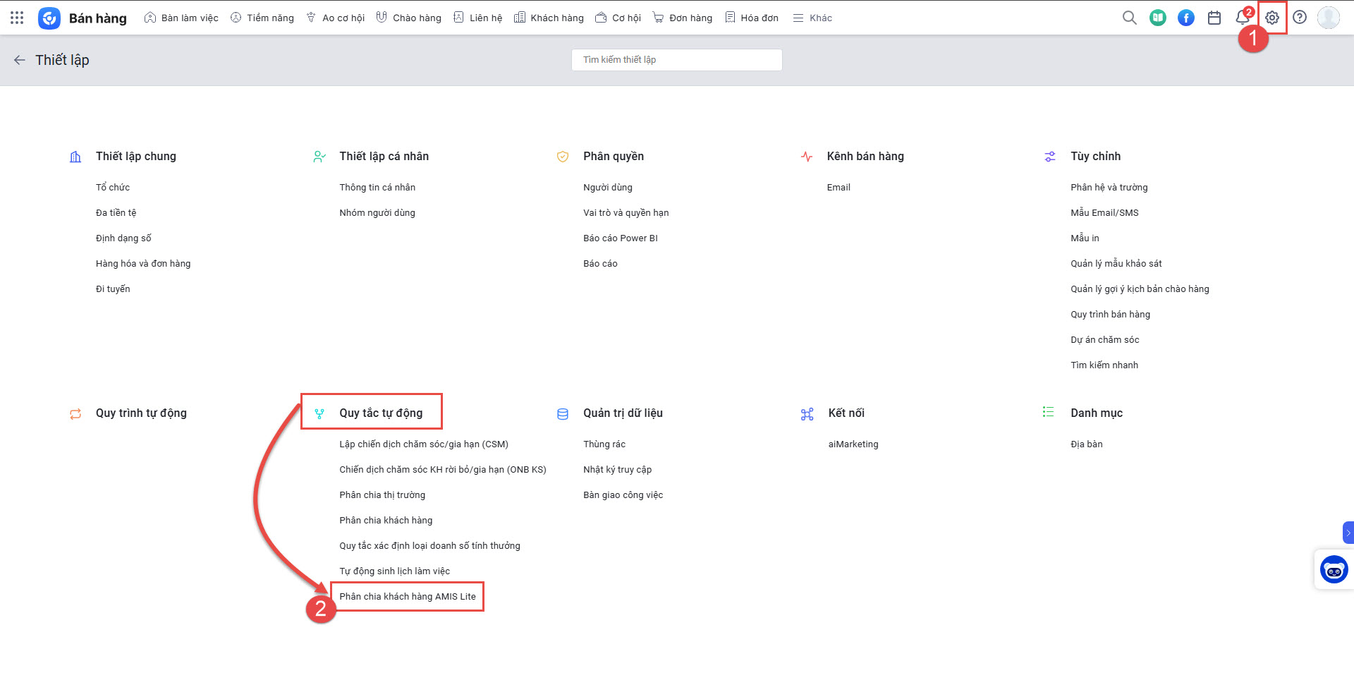 - Trên ứng dụng CRM, anh/chị truy cập Thiết lập/Quy tắc tự động/Phân chia khách hàng AMIS Lite.