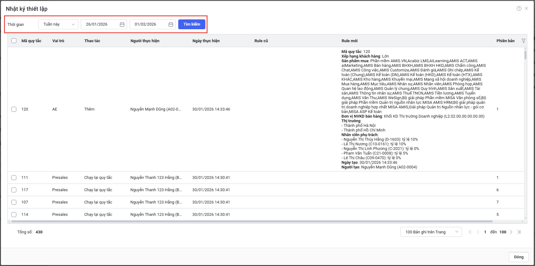 Rule mới: nội dung rule sau thay đổi – trường hợp xóa thì để trống, trường hợp tạo mới thì Rule cũ để trống. Phiên bản: phiên bản/thứ tự lần thay đổi của rule đó.