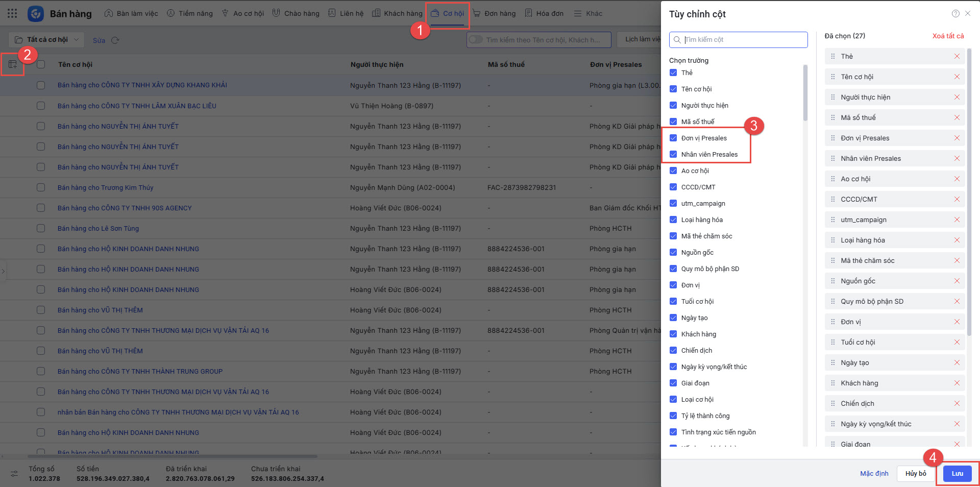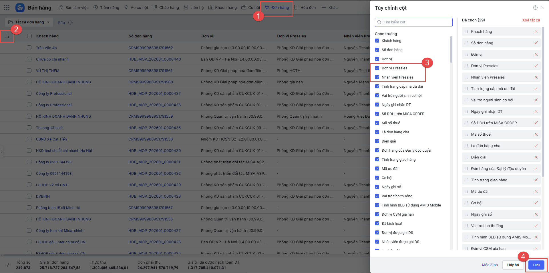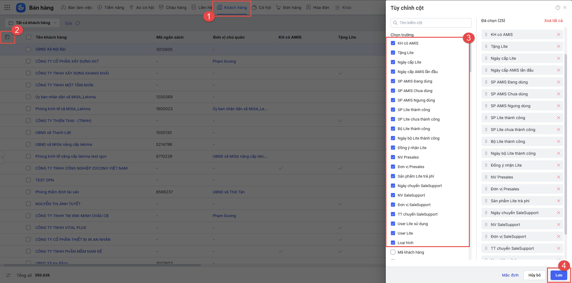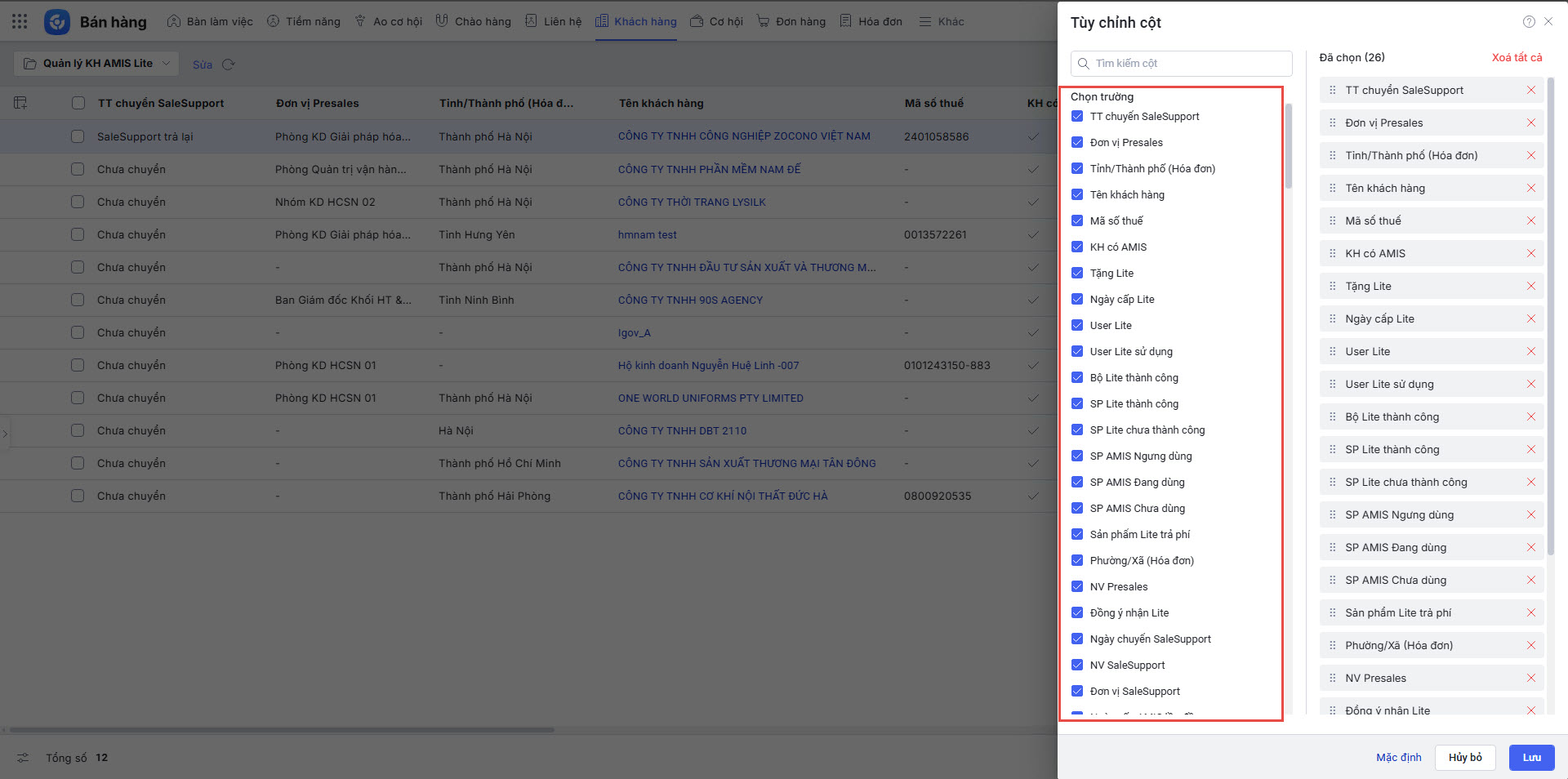 - Anh/chị truy cập phân hệ Khách hàng, tìm kiếm và chọn các trường thông tin để lấy lên danh sách.
