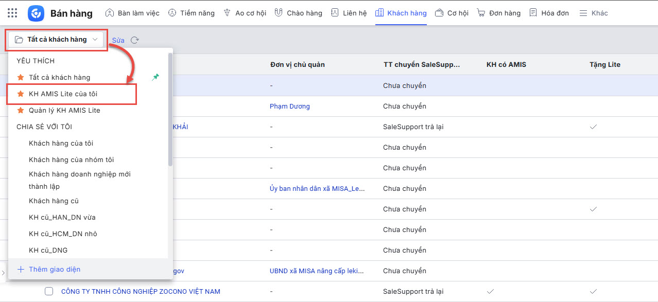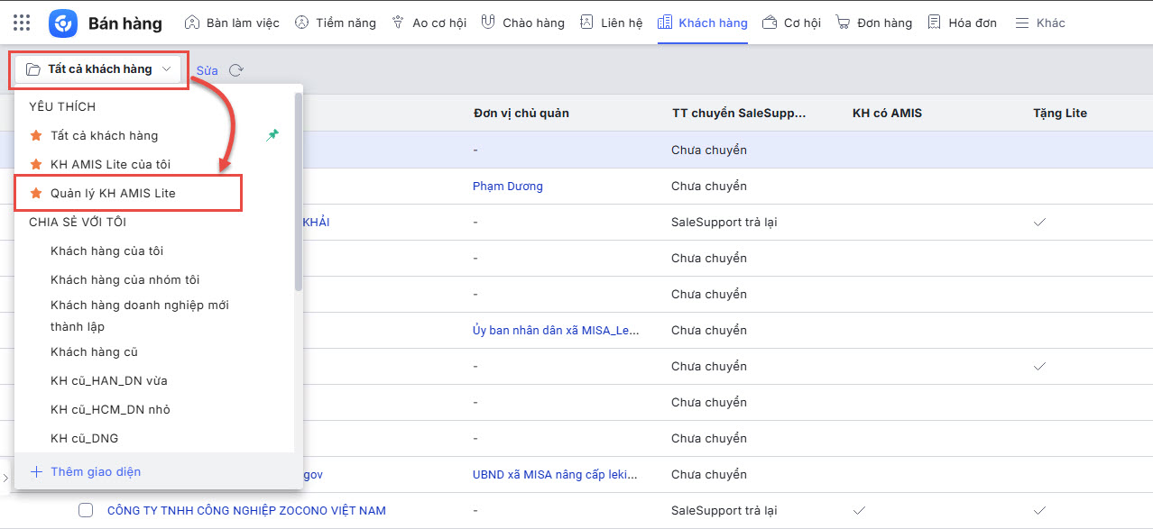 - Trên giao diện Tất cả khách hàng, anh/chị chọn chuyển sang giao diện Quản lý KH AMIS Lite.