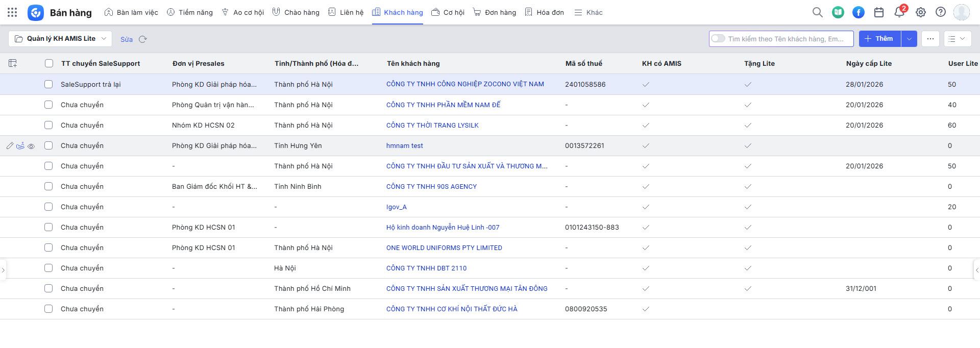 2.2. Giao diện và các trường thông tin mới trên phân hệ Khách hàng cho bộ phận Presales và Sales Support thuộc team triển khai AMIS Lite