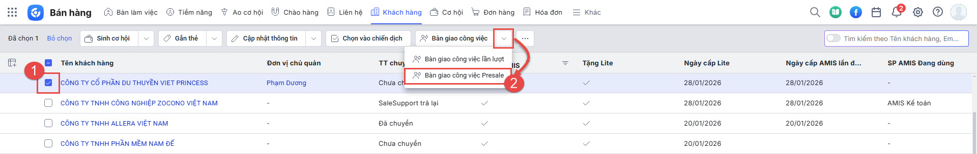 Lưu ý: NV Presale chỉ được bàn giao KH do chính mình phụ trách và KH phải được đánh dấu Tặng Lite.- Tại màn hình danh sách khách hàng, anh/chị tick chọn Khách hàng cần bàn giao cho Nhân viên khác => nhấn Bàn giao công việc Presale. Trường hợp bàn giao nhiều khách hàng, anh/chị thực hiện tương tự: tick chọn nhiều khách hàng => nhấn Bàn giao công việc Presale.