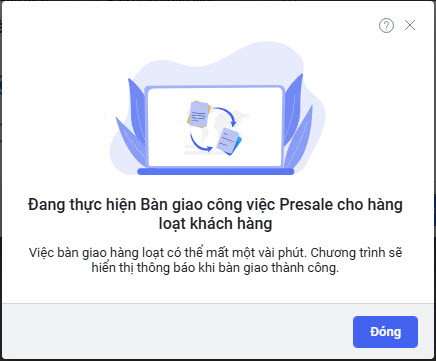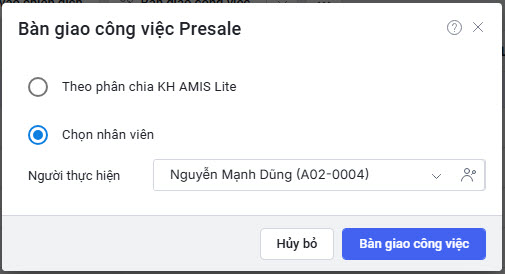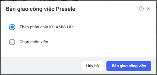 - Hệ thống sẽ hiển thị pop-up Bàn giao công việc Presale gồm 2 lựa chọn: