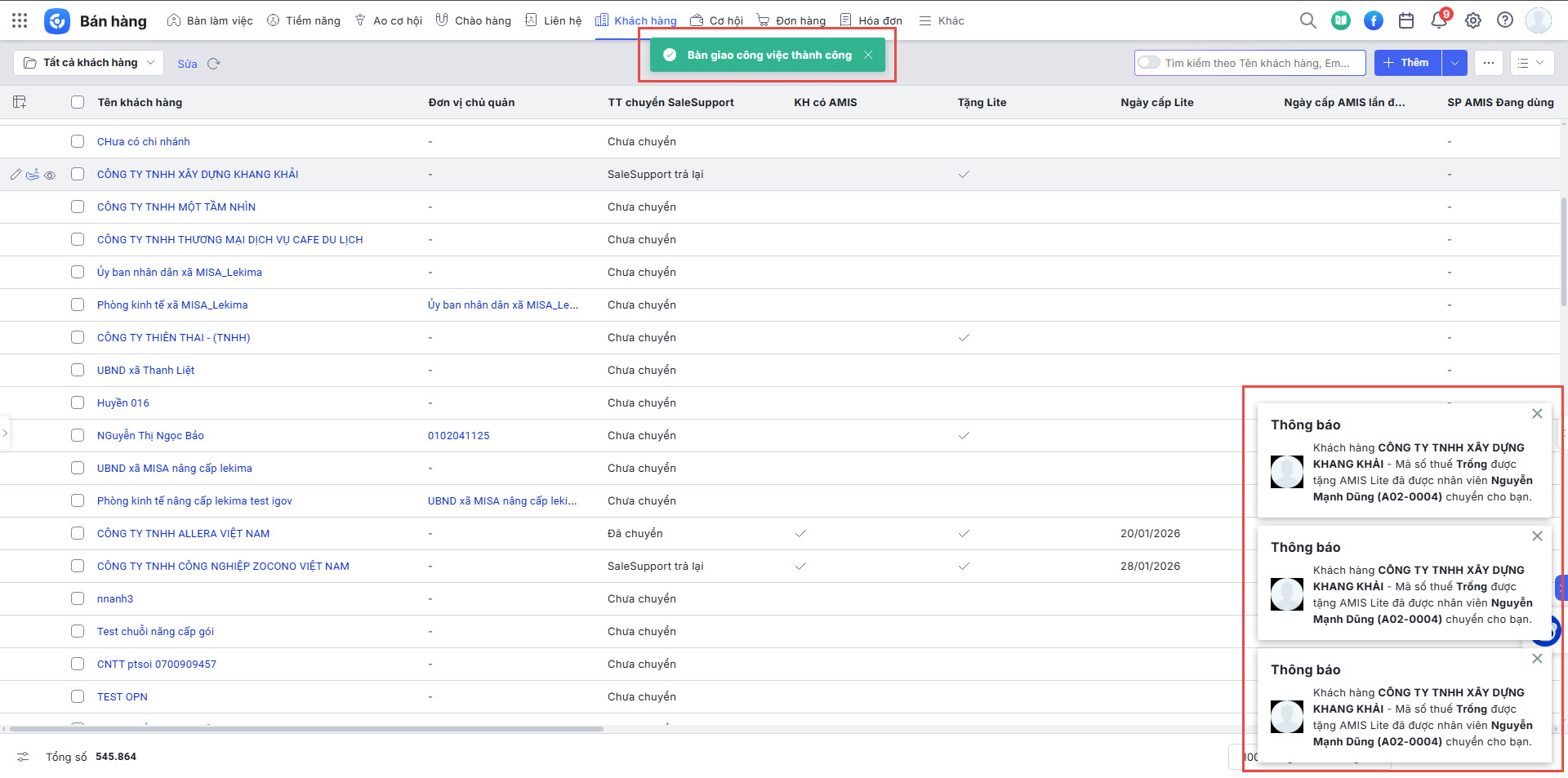 Chuyển thành công, hệ thống sẽ hiển thị thông báo và cập nhật thông tin cho các Khách hàng: