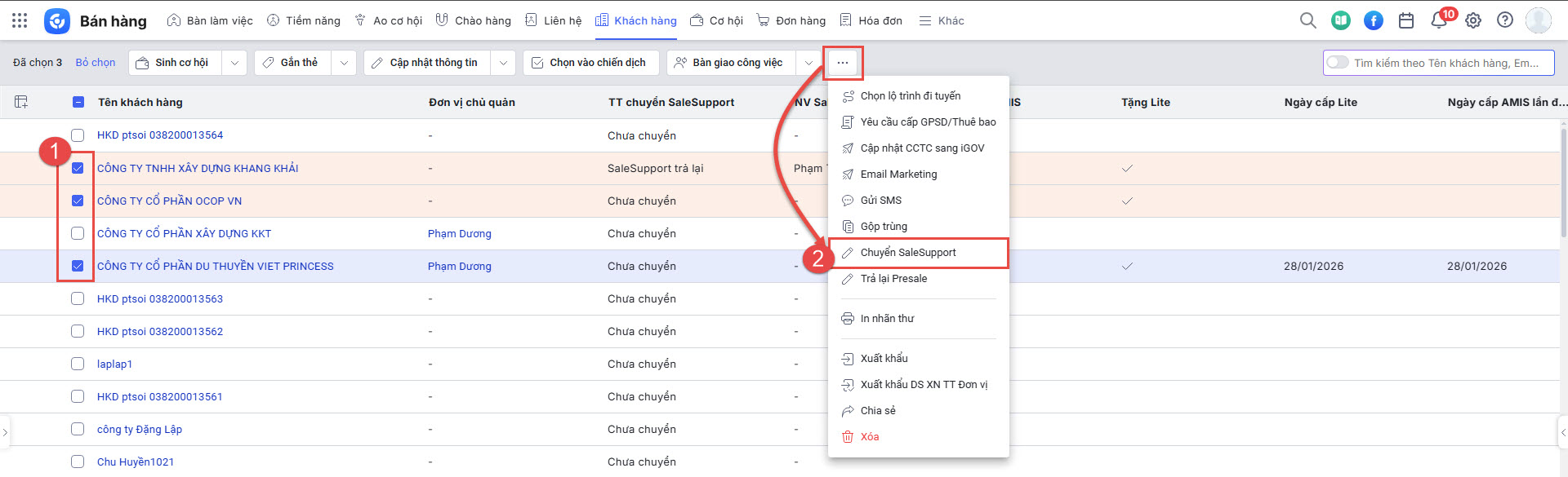 Lưu ý: NV Presale chỉ được chuyển KH do chính mình phụ trách- Anh/chị tick chọn những Khách hàng đã sử dụng thành công bộ AMIS Lite => nhấn Chuyển SaleSupport.