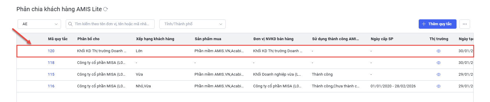 - Thao tác tương tự như vai trò Presale, anh/chị chọn vai trò AE => nhấn Thêm quy tắc.